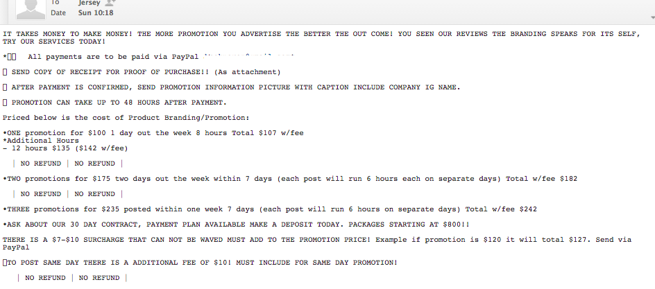 I contacted a few Instagram promoters in regards to their rate information and I was shocked. The emails I received from their gmail accounts no less were forwards that had been sent to everyone with no real explanation of how the plans worked.
