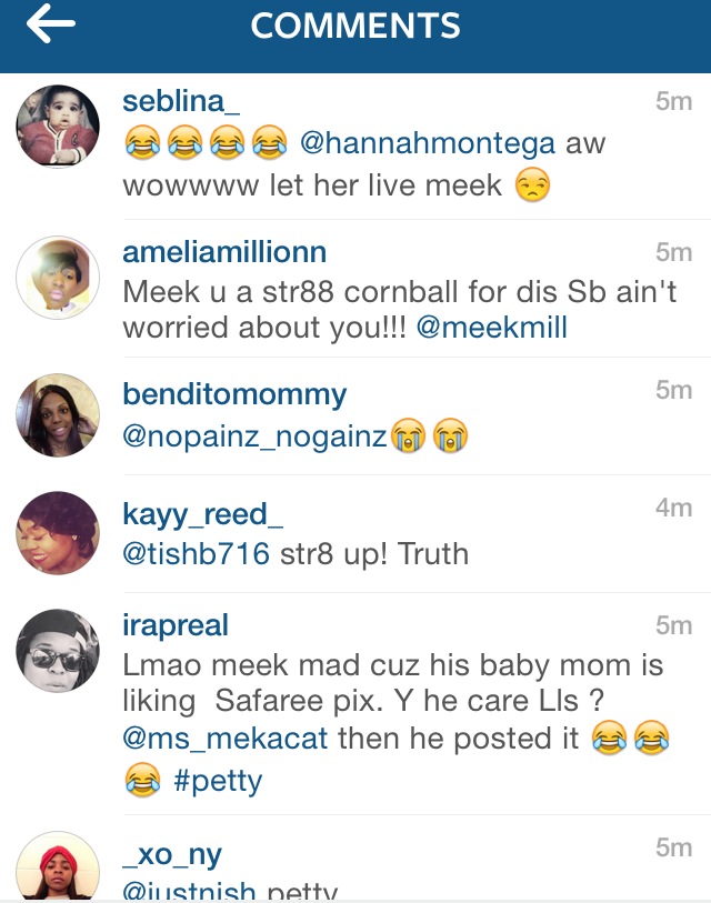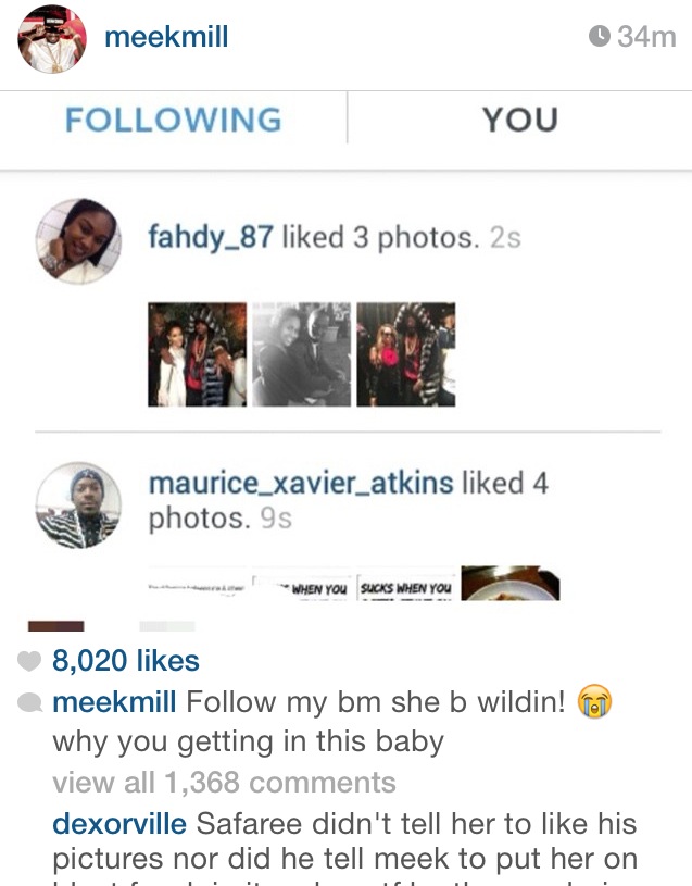 Meek Mill took to his Instagram throwing shots at his baby’s mother for liking Nicki Minaj’s Ex Safaree Samuels Photo’s!