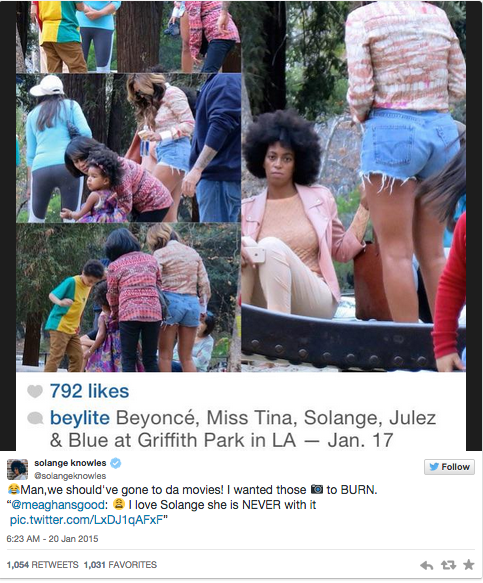 Solange, Beyonce, and Blue along with other family members went to the park for some quality time. Well Solange got wind of a univited photographer at their family gathering. The face she made for the camera’s was priceless.