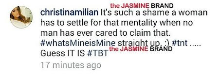 Milian caught wind of this and responded to Steffans. In her response she explained how sad it was for women to react out of character when a man never claimed them. Then ending with a hashtag “whatsmineismine”.