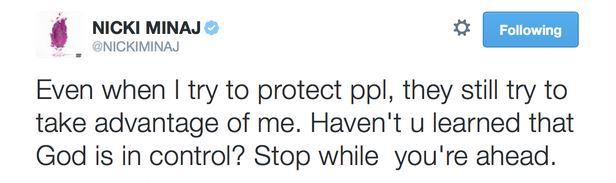 These interviews have spiralled into an all out Twitter war between the former lovers. Nicki Minaj took to twitter claiming all she has done to protect, provide, and care for him during the difficult time.