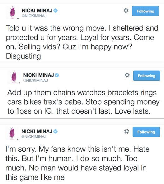Announcing what she has brought for him in the past and how he has made her feel since the break-up. Minaj explains that Beezy was trying to blackmail her. After reading her tweets I just knew that her ex-boyfriend would go off. To my surprise he was actually a complete gentleman.